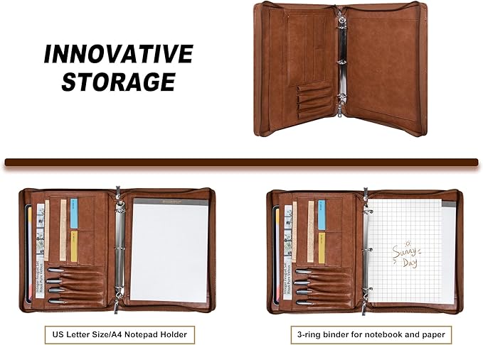 - MORE SPACE: Equipped with A4 writing pad, business card holder, pen tray, tablet pocket, 3-ring binder, zipper pocket for secret documents, large compartments and more. It neatly accommodates a large number of work files and increases your productivity.