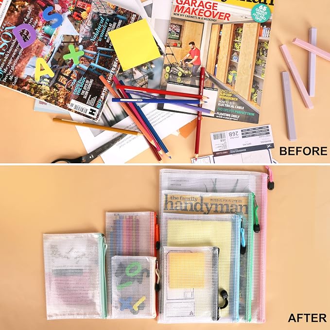 - 【Various Applications】: Multi-size mesh zipper storage pouches can be used for documents, toiletries, bills, receipts, photos, school supplies and etc. Some sizes can be used to store travel items such as toothbrushes, cosmetics and jewelries. Some can be used to store toys and DIY gadgetry.