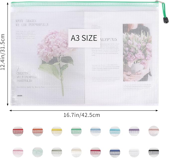 - PRODUCT SIZE: The mesh zipper pouch is 16.7" x 12.4"/42.5cm x 31.5cm. Larger A3 size paper. Please confirm the product size before purchase.