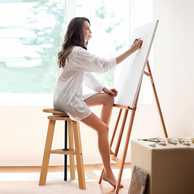 - [Craft in Comfort] The maximum load-bearing capacity of the painting stool is 176 lbs (80kg). Our adjustable height wooden stool is perfect for artists, adults, and anyone who wants to create in comfort. With a swiveling seat that adjusts from 19" to 26", you can customize the height to fit your needs and work surface.