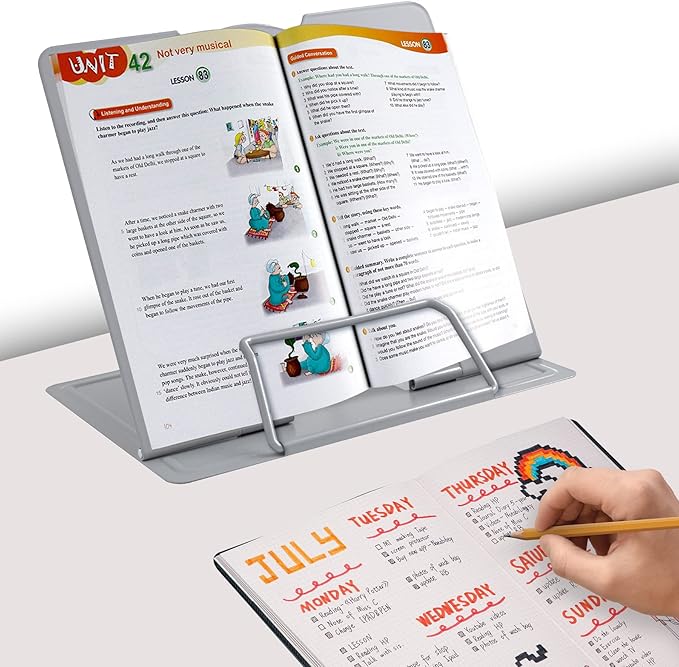 - 【Book Holder for Reading】The book holder is designed for keeping your hands-free when we are reading cookbook magazine painting papers documents text books sheet music catalogs notetablet or iPad. Support thicker books in school library dorm office or any other desktop.