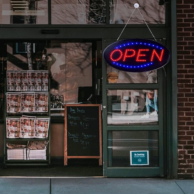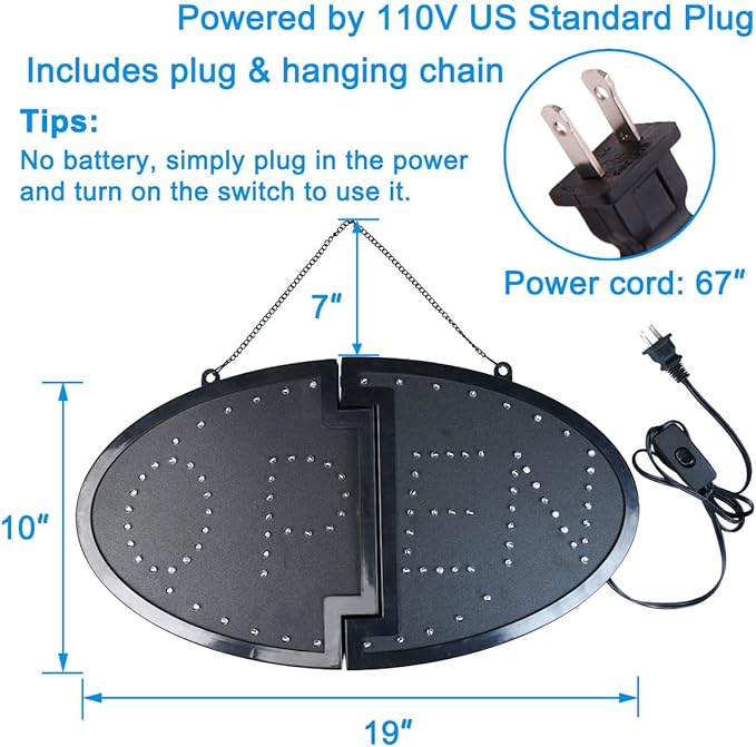 - EASY TO USE: Open sign board comes with a sturdy stainless-steel hanging chain to hang anywhere you want to display, then plug in and turn on the switch, and your storefront window will instantly light up with a dazzling new sign.