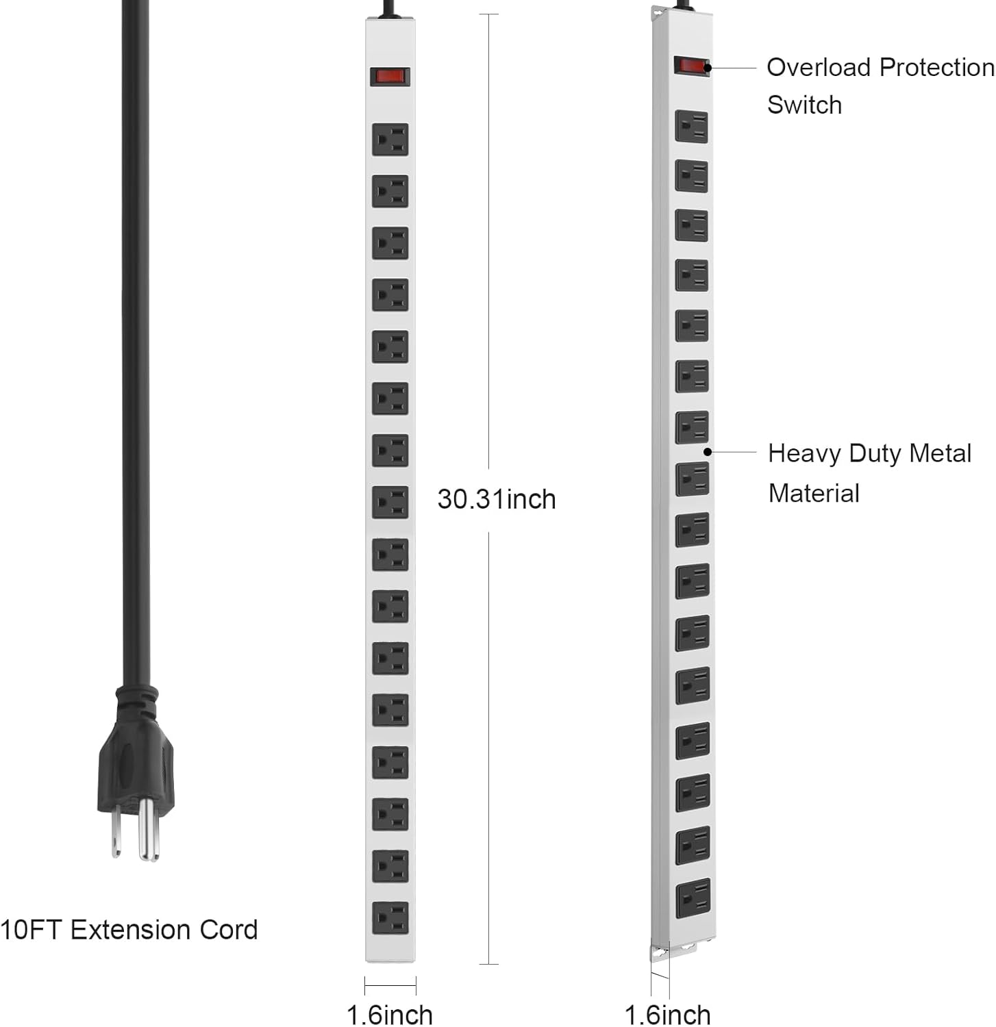 - Long Power Strip 16 Outlet: Providing enough space between the sockets to accommodate big plugs. heavy duty surge protector was connected with 10ft 14AWG/3C power cord, Equipped with 15A high current, Max: 60Hz/125V/15Amp/1875W.