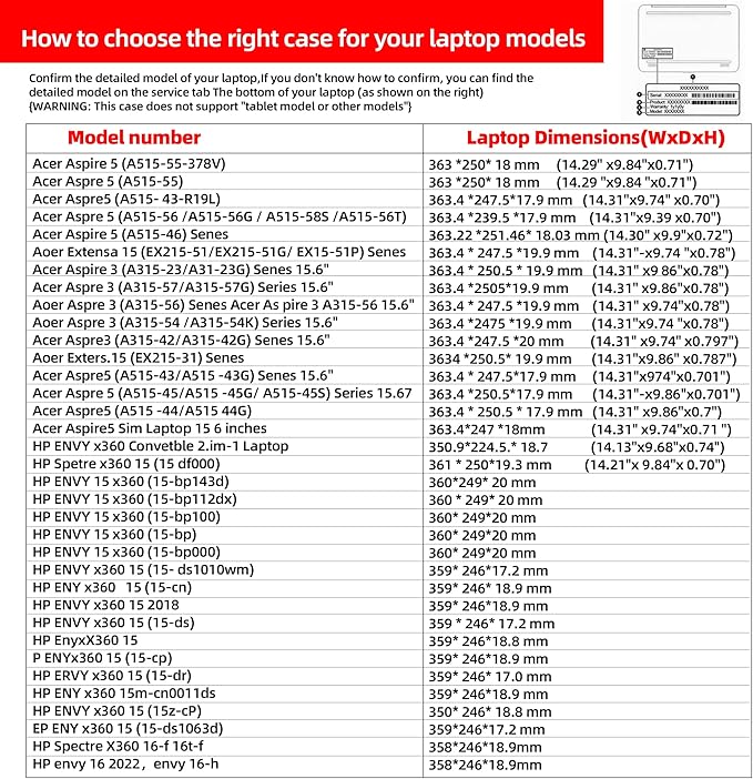 - This PC case is compatible with HP Laptop - 15z 15t 15-dy series HP ENVY 15 x360 15-bp, 15-ds, 15-cn, 15-cp, 15-dr series; Acer Aspire 5 A515-55, A515-43, A515-56, A515-46, A515-45, A515-44 series, Aspire 3 A315-42, A315-54, A315-56, A315-57, A315-23 series; Extensa 15 EX215-31, EX215-51 series laptop. (excluding equipment)