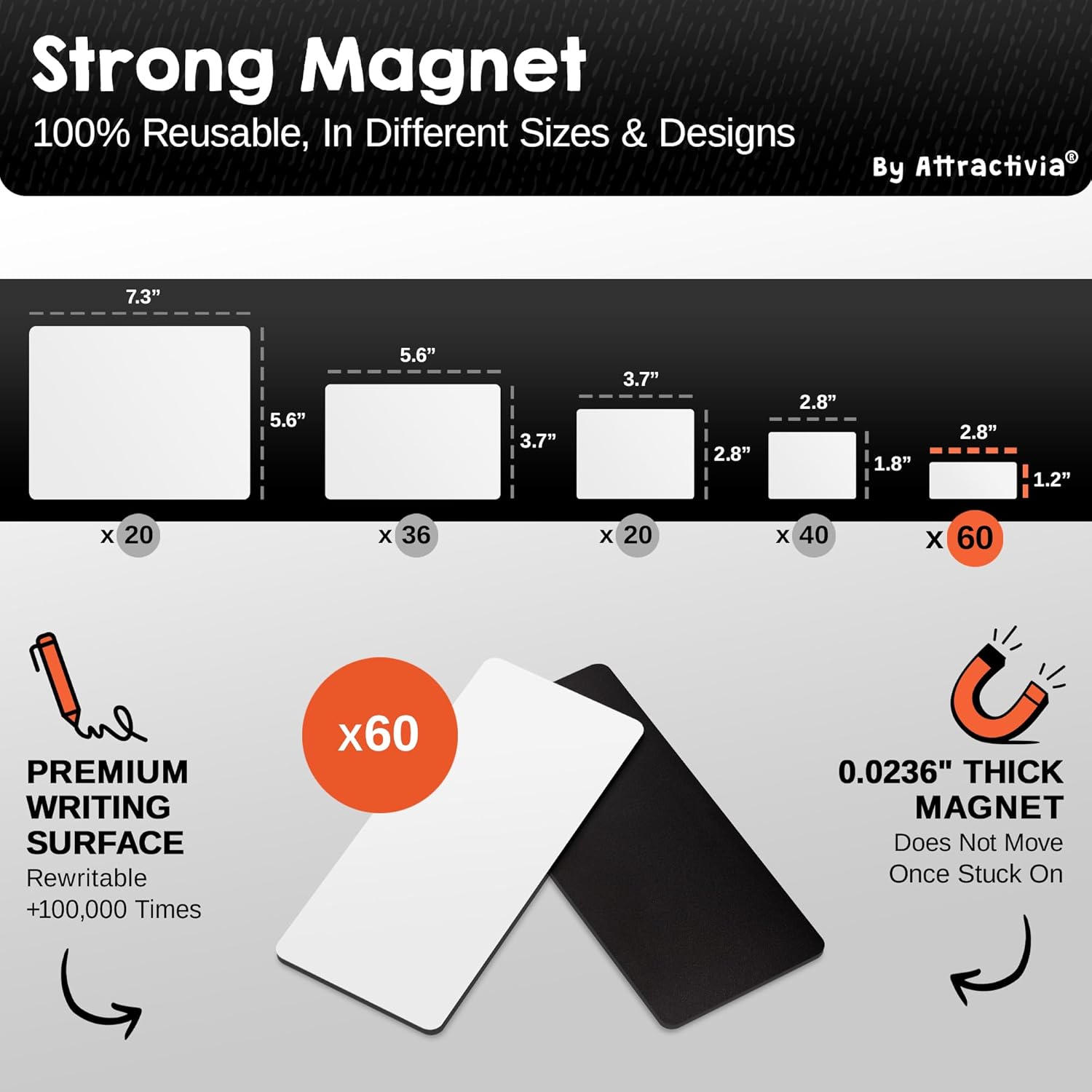 - Strong Magnetic Hold: Our dry erase magnets feature a powerful 0.02 inch thick magnetic back for instant and secure adhesion to any metallic surface, whether flat or slightly curved. Easily attach our dry erase stickers labels and remove without residue, ensuring a firm grip even on rounded surfaces.