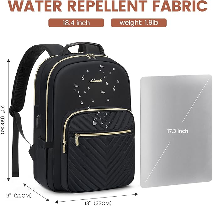 - 💯【Upgraded Laptop Backpack Women】: Classic V-shaped embroidery thread. Upgraded double LOVEVOOK no-slip metal zippers,water resistant Nylon fabric with polyester lining, ensures long lasting usage. Total of 4 compartments and 16 pockets for your computer,A4 folder,bottles,umbrellas,clothes,work supplies,college supplies and travel essentials.Dimensions: 13"L 20"H 9"D, Weight: 1.9lbs.