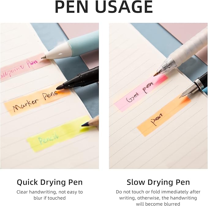 - [WRITABLE AND POSITIONABLE] The label is half self-adhesive, and can be repositioned for easy pasting and marking, and clean up. Different pens bring different effects to the sticky notes, (easy-dry pens: ballpoint pens, pencils, markers; difficult-to-dry pens: fountain pens, gel pens, ink-based pens, etc).