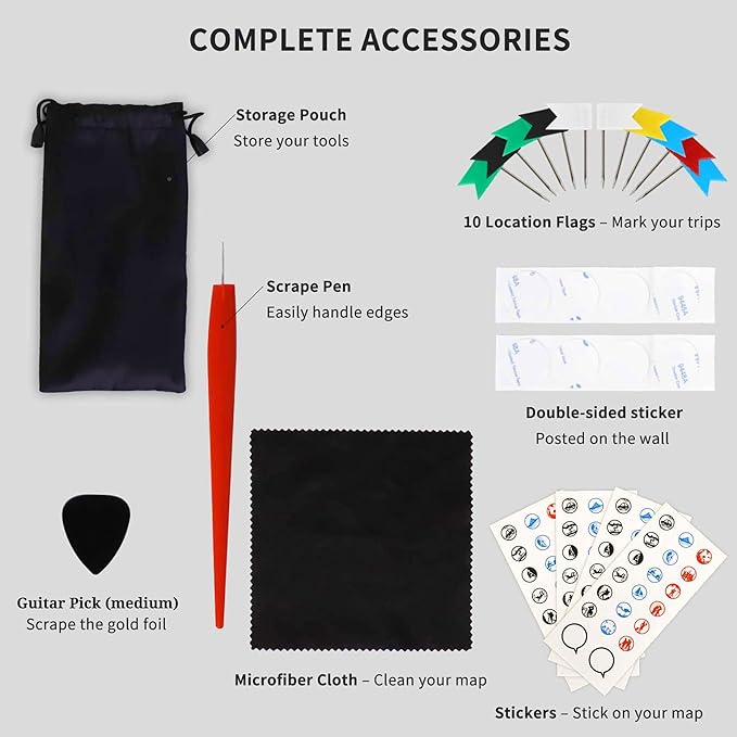 - đ Complete Travel Map Set With Accessories: Our USA scratch off map comes with 10 location flags, 1 scrape pen, double-sided stickers for wall hanging, 1 guitar pick, activity stickers, and 1 microfiber cloth for easy cleaning of the scratch map.