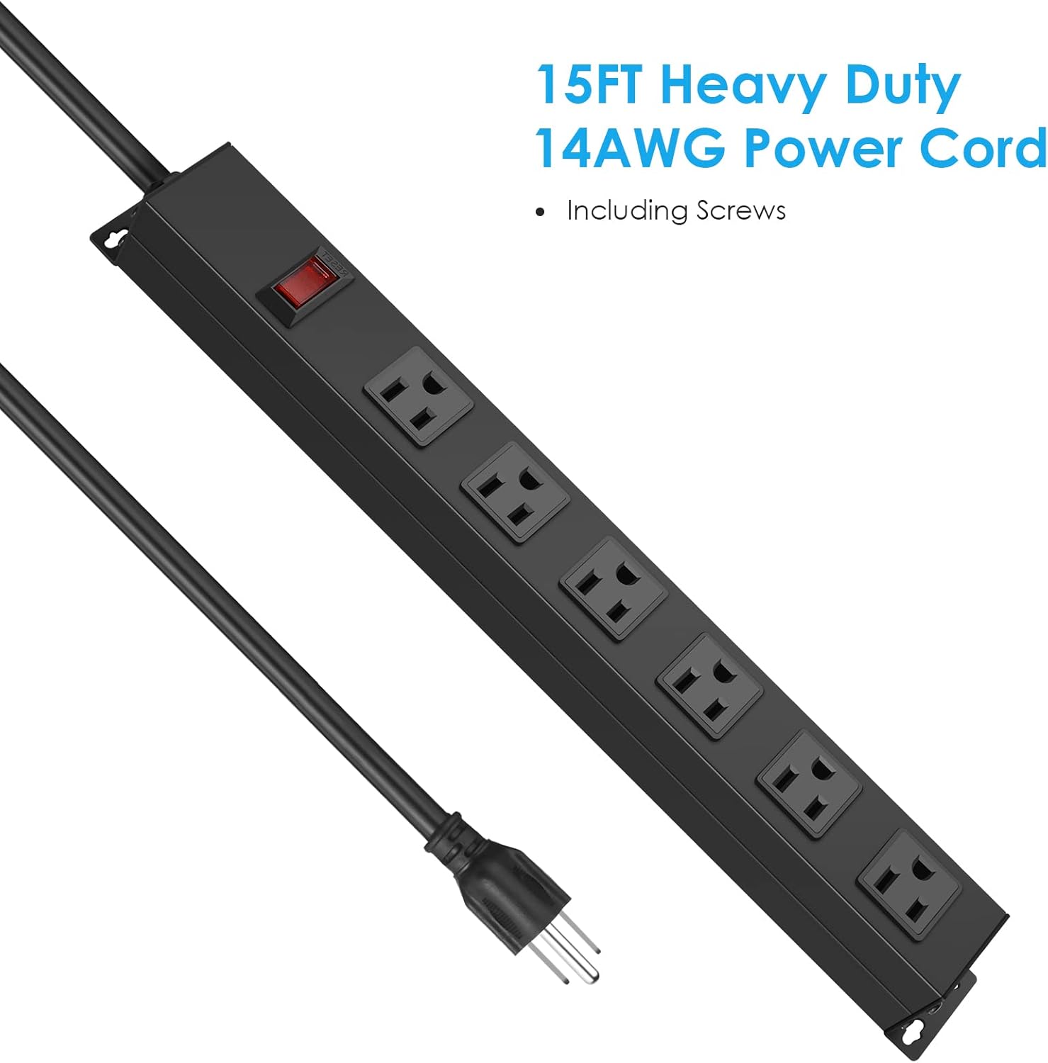 Metal Wall Mount Power Strip, Mountable Power Outlet with 6 AC Outlets, Aluminum Alloy Mount Power Socket with Switch, 15 FT SJT 3/C 14AWG Power Cord, 15A 125V 1875W (6AC) Black