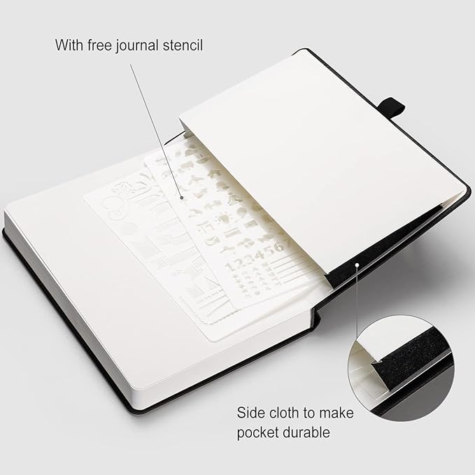 - Humanized Design: Numbered pages, index content pages, and 2 bookmarks help you find important content faster. Journal stencil included, a perfect tool for bullet journaling. Back inner pocket holds notes, business cards, small gadgets, etc. Closes with an elastic band and has a pen holder loop for any pen