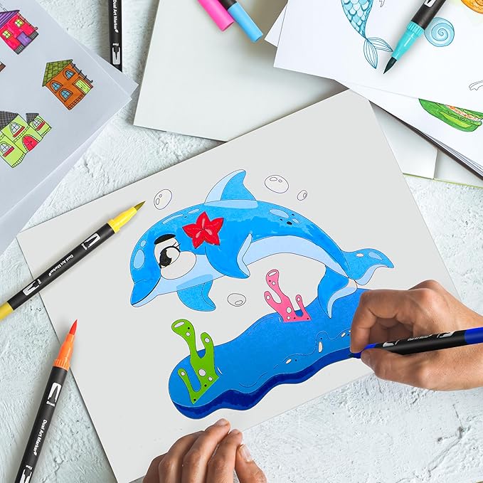 - 🎨Dual Brush Marker Pens:The coloring markers have a dual tip design with a 1-2mm brush tip and a 0.4mm fine tip, allowing you to create medium or bold strokes by varying the pressure of the brush, while experiencing fine strokes with the fine tip.The 0.4mm fine tip markers are great for sketching, tracing, and detailing, while the 1-2mm brush tip markers are great for giving large areas of color. The dual-head design fully meets your needs in different situations.