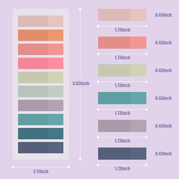 - Package Include: 2 styles (3 sheets/style) of sticky index tabs in this package, 6 sheets 1200 pieces tabs total, 0.42*1.75 inch sticky tabs with 60 different morandi colors.