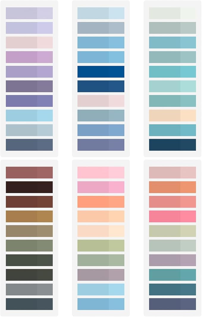 - Package Include: 2 styles (3 sheets/style) of sticky index tabs in this package, 6 sheets 1200 pieces tabs total, 0.42*1.75 inch sticky tabs with 60 different morandi colors.
