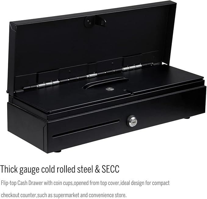 - Flip-top Cash Drawer is made of thick gauge cold rolled steel and SECC, with coin cups, opened from top cover,ideal design for compact checkout counter,such as supermarket and convenient store.