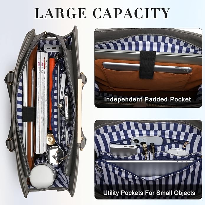 • 【COMFORTABLE & FASHIONABLE DESIGN】The size of the briefcase for women is 16.5 x 6 x 12 inches (L*W*H), the length of the detachable shoulder strap: 25 - 43 inches. This laptop bag for women has a comfortable leather handle, adjustable and detachable shoulder strap, and a secure top zipper closure. A charging jack for easy charging daily. With such a large organized laptop tote bag, it can satisfy all your daily necessities.