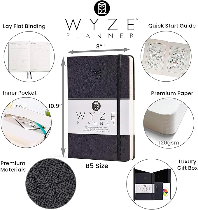 - PREMIUM 12-MONTH UNDATED PLANNER WITH COMPREHENSIVE GUIDE - Crafted with superior quality materials for a luxurious feel & look. This planner provides a clear blueprint for setting and achieving goals daily, weekly, and monthly. Start any time with its flexible, undated format, designed for efficiency and success.