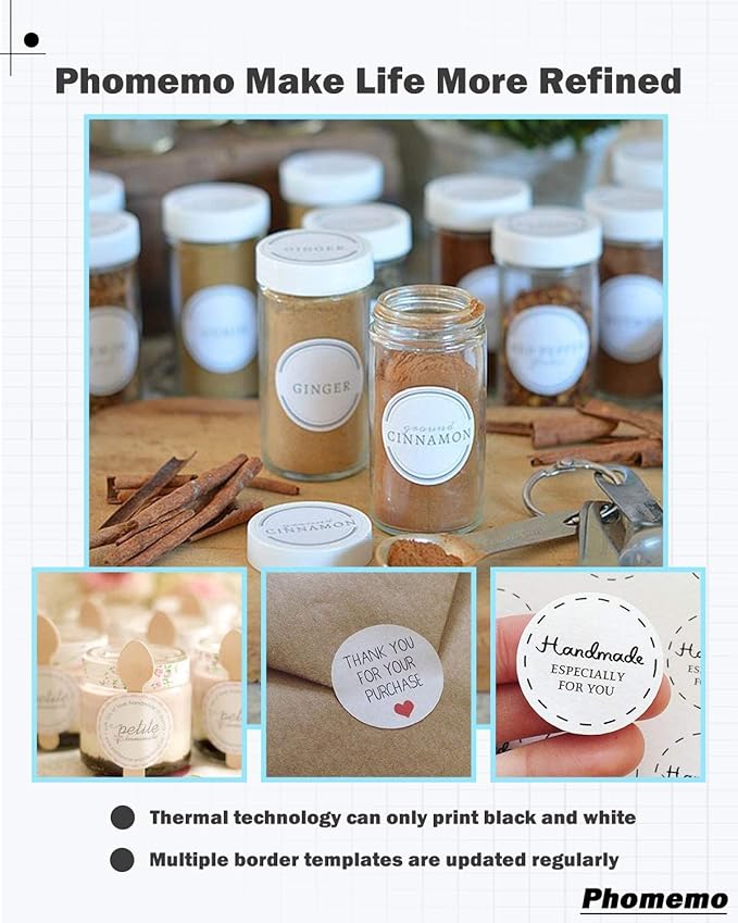- 【Widely Used】Phomemo M110 labels are suitable for logo labels, product labels, business stickers, handmade goods, bakery stickers, wedding stickers, or mail envelope seals. containers, supply cabinets, storage boxes, personal items, crafts, gifts, files and more for identify items and quickly organize. It can be used not only at home, but also widely used in offices, schools, supermarkets, retail stores, jewelry stores, libraries, pharmacies, etc.