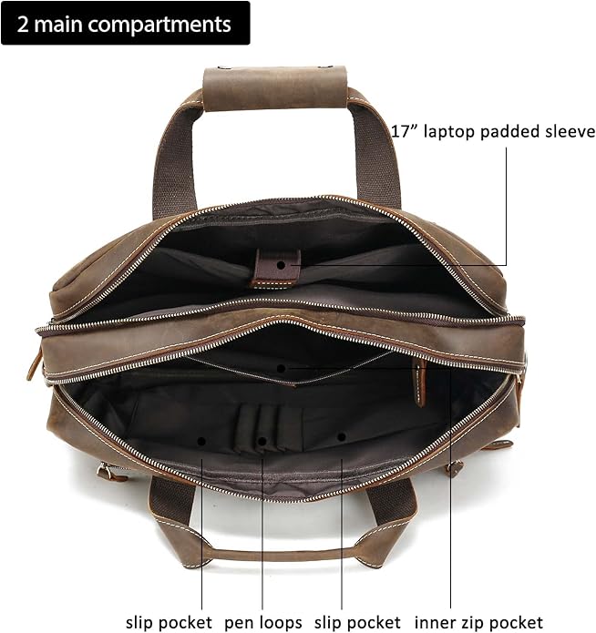 - Structure: 2 main compartments, 1 panel pocket, Extra 1 A4 file pocket, 1x 17 inches inner padded laptop sleeve case, 3x card slots, leather hooks for keys/cables.