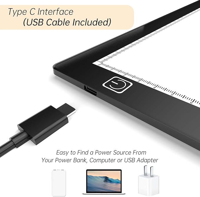- Type-C USB Interface: This light pad comes with Type-C USB cable. With USB Interface, you can easily find a power source anywhere, the power bank, your computer or with USB adapter