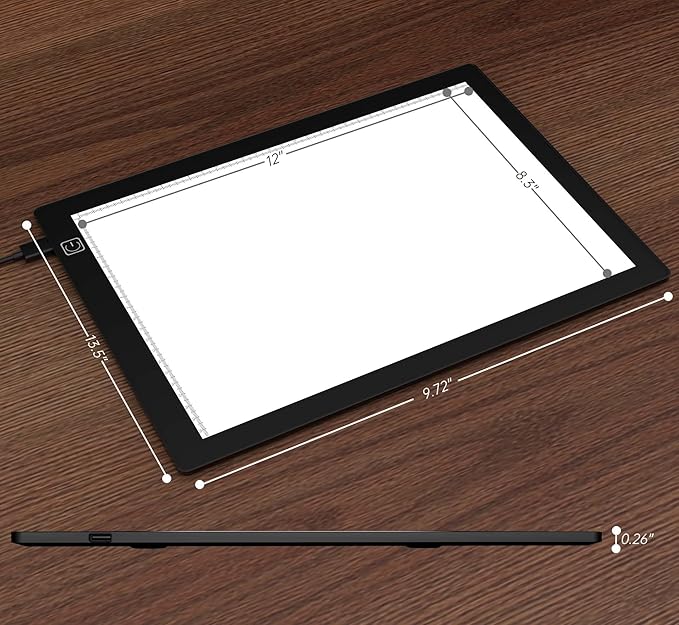- Super Bright, Even and Flicker-Free Illumination: This light box adopts double-sided LED light design(brightest A4 size light pad you can find in the market), providing brighter and more even light than other one-side light box. The Flicker-Free LED helps relieve visual fatigue in long time usage. Max brightness: 5490Lux. LED Life Span: 50000 hours.