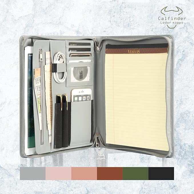 - INNOVATIVE STORAGE-This leather portfolio both for men and women has excellent functionalityand practicality. Elaborately crafted gray leather padtfolio with useful features including 2 pen holders, an adjustable phone pouch, 5 business card holders, letter-size notepad/legal pad/ notebook holder, a large zipper pocket, document pockets plus a 13-inch ipad/tablet sleeve.