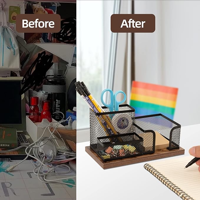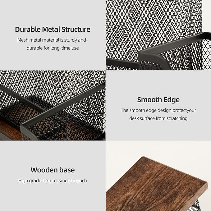 - 【Mesh Metal Office Organizer】: Made of sturdy, mesh metal and elegant antique wood base, take full advantage of your workspace and keep your desktop clear. Pen organizers' beautiful outlook and elegant design will make your desk shine!