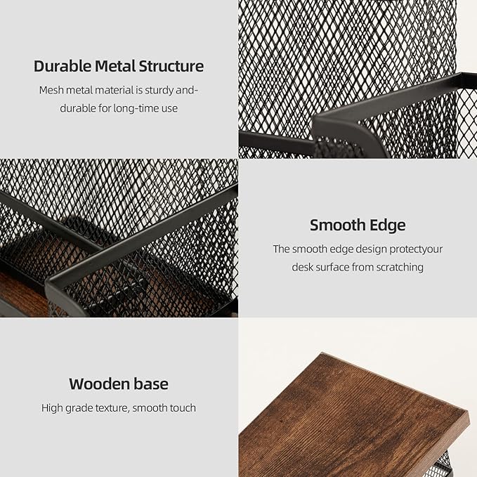 - 【Mesh Metal Office Organizer】: Made of sturdy, mesh metal and elegant antique wood base, take full advantage of your workspace and keep your desktop clear. Pen organizers' beautiful outlook and elegant design will make your desk shine!