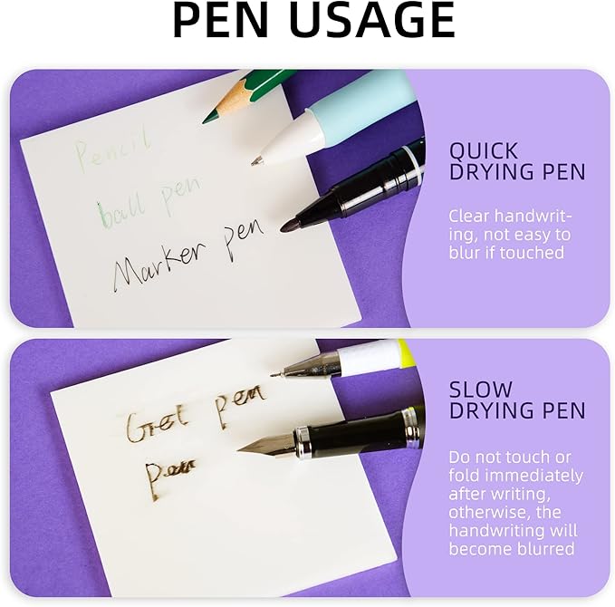 - [WRITABLE AND POSITIONABLE] The sticky notes clear is half self-adhesive and can be repositioned for easy pasting and marking, and clean-up. Removes easily and doesn't roll up like a sticky note. Different pens bring different effects to sticky notes,(easy-dry pens: ballpoint pens, pencils, markers; difficult-to-dry pens: fountain pens, gel pens,ink-based pens, etc).