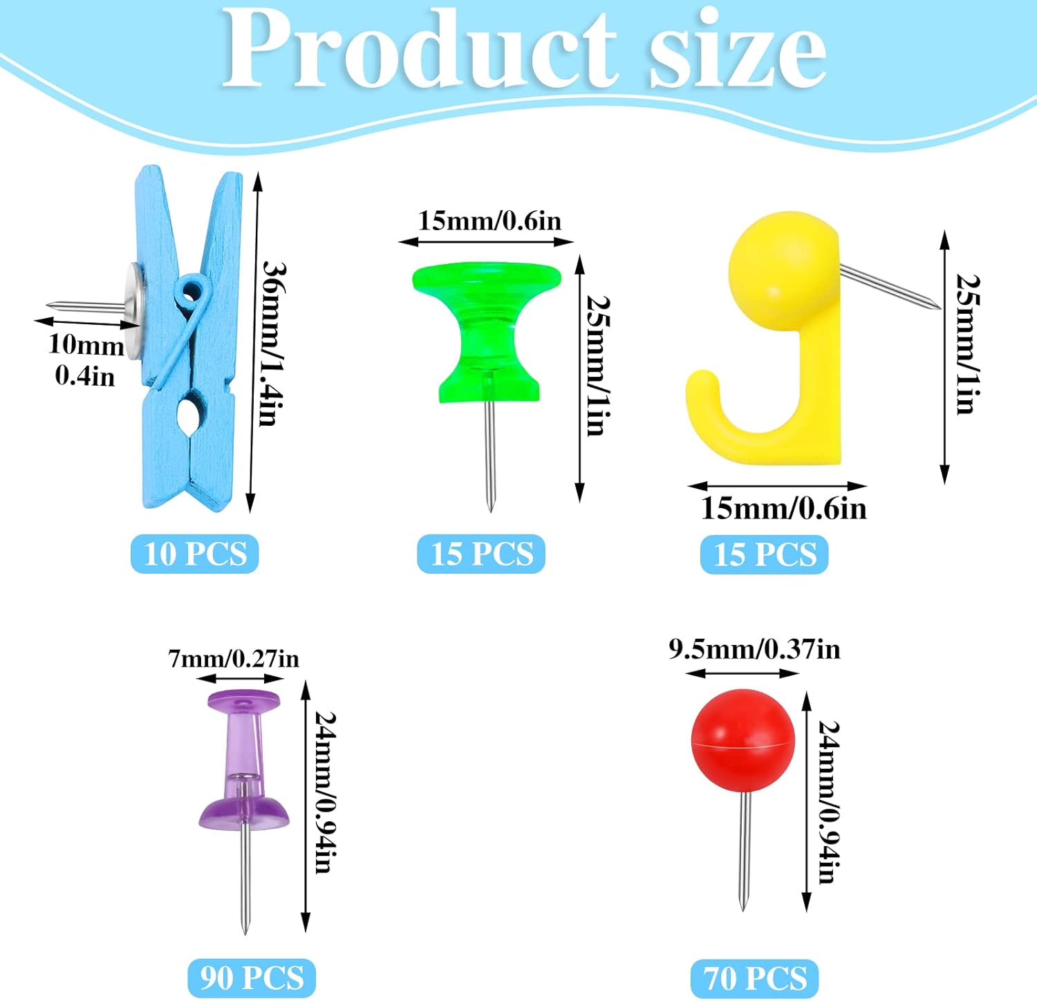 - 【Variety of Styles】You will receive 200Pcs push pins of 5 types in a plastic box, includes 10 wooden clips pins, 15 big size clear I-shaped map marking pins, 90 small size colors I-shaped map marking pins, 15 push pin hooks, 70 roundness thumb tacks. Ample quantity and rich styles are enough to meet your daily needs.