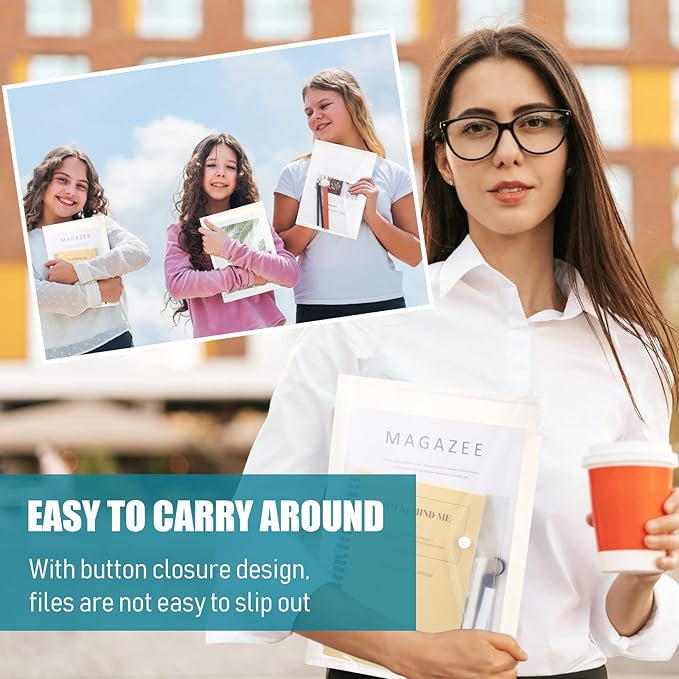 - Button Closure Design: the A4 size envelope folder designed with snap button, making it easy to open and store files, and the files will not easy to slip out and not easy to lose; The poly envelope is transparent which keeps contents visible, you can easy to find files without opening the envelope