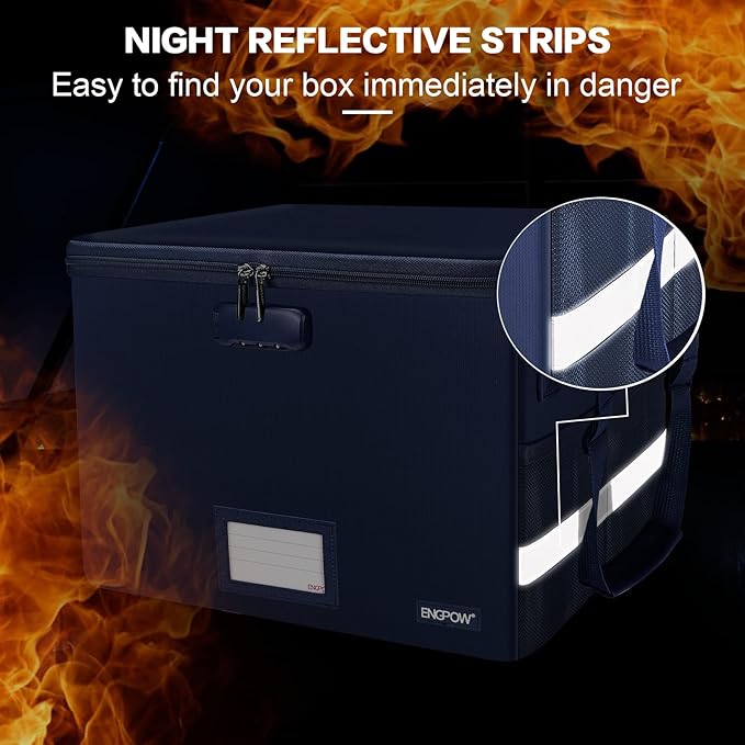 - Dust-proof and reflective strip design:Are you still worried about the storage box is often covered with dust? The dust-proof material can prevent dust from sticking to the outside of our fireproof box, always keep it neat and tidy.The reflective strip design on the side of the box allows you to immediately find your fireproof box even at night, protecting irreplaceable documents and valuables from fire.