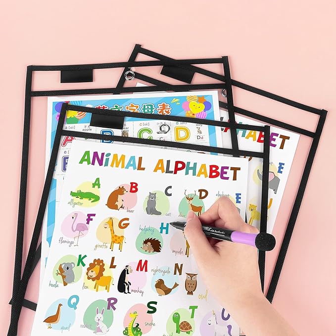 - Smart Design: At the top of our dry erase pocket, the black tag is a pen loop, and the middle hole allows you to hang it vertically on the wall for displaying artworks, worksheets, small samples.