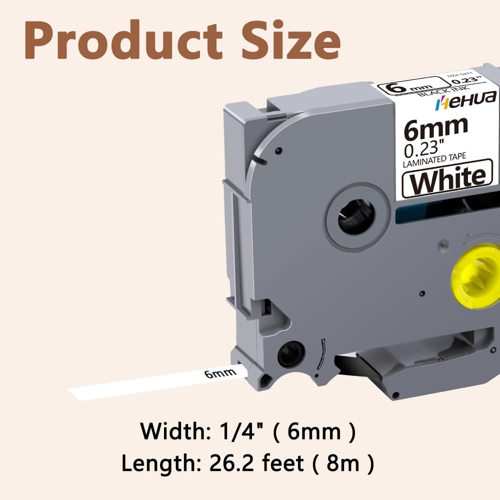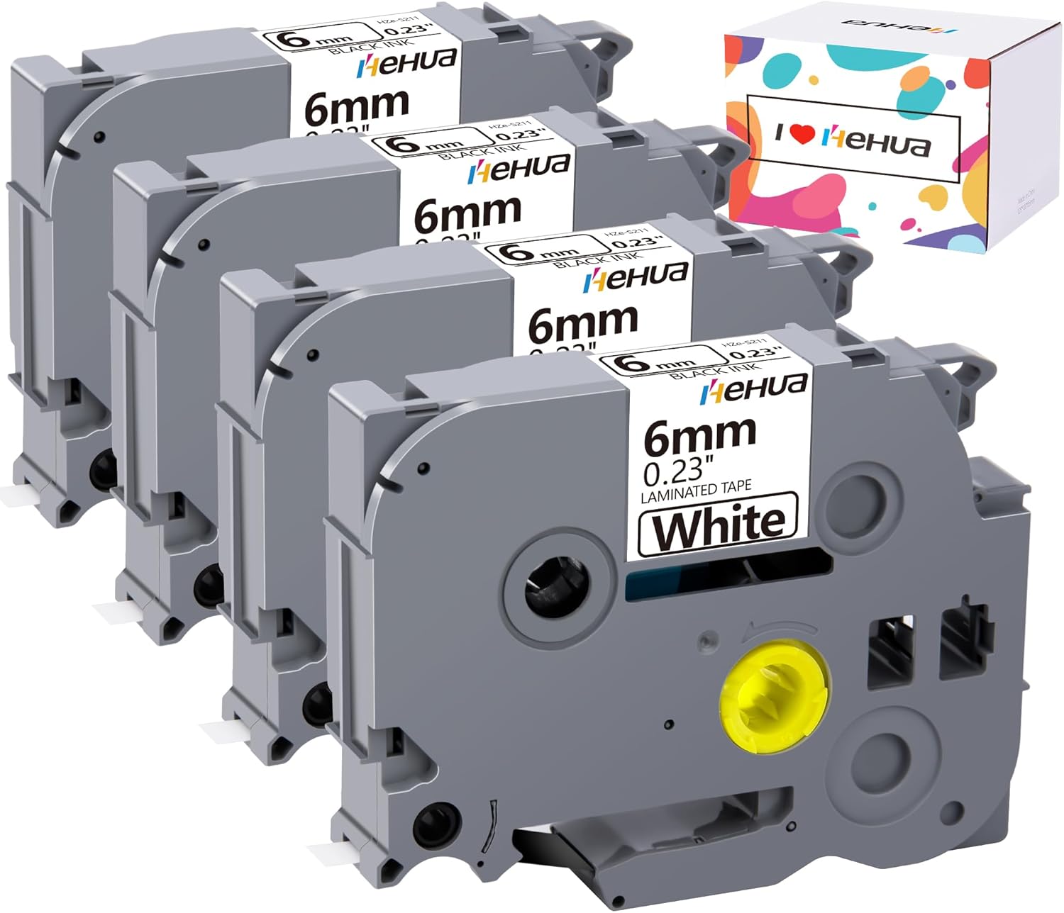 Hehua 6mm 0.23 Extra Strength Adhesive Laminated White Tape Compatible for Brother TZe-S211 TZeS211 TZ-S211 TZS211 for Ptouch PT D210 D200 H110 H100, 1/4'' x 26.2ft Black on White, 4 Pack