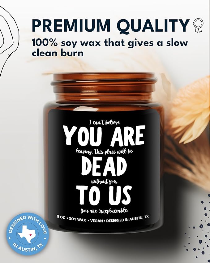 - 💠 Funny Gift for Coworker: These woodwick candles are a fun way of sending love & appreciation to your coworker! It has a fun message on the label that says "I can't believe YOU ARE leaving. This place will be DEAD without you. TO US your irreplaceable". Great gifts for women coworker, work besties gifts for women, co-worker gift ideas, retired gifts for women & co worker leaving gift woman!