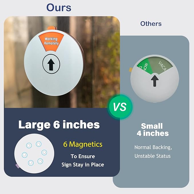 - 【EASY TO ROTATE】 - Simply spin the knob to rotate between status. Each status has a small magnet to helps securing the status in place. (NOTE: The sign’s magnet is intended for stabilizing the status only, and cannot stick directly to metal)