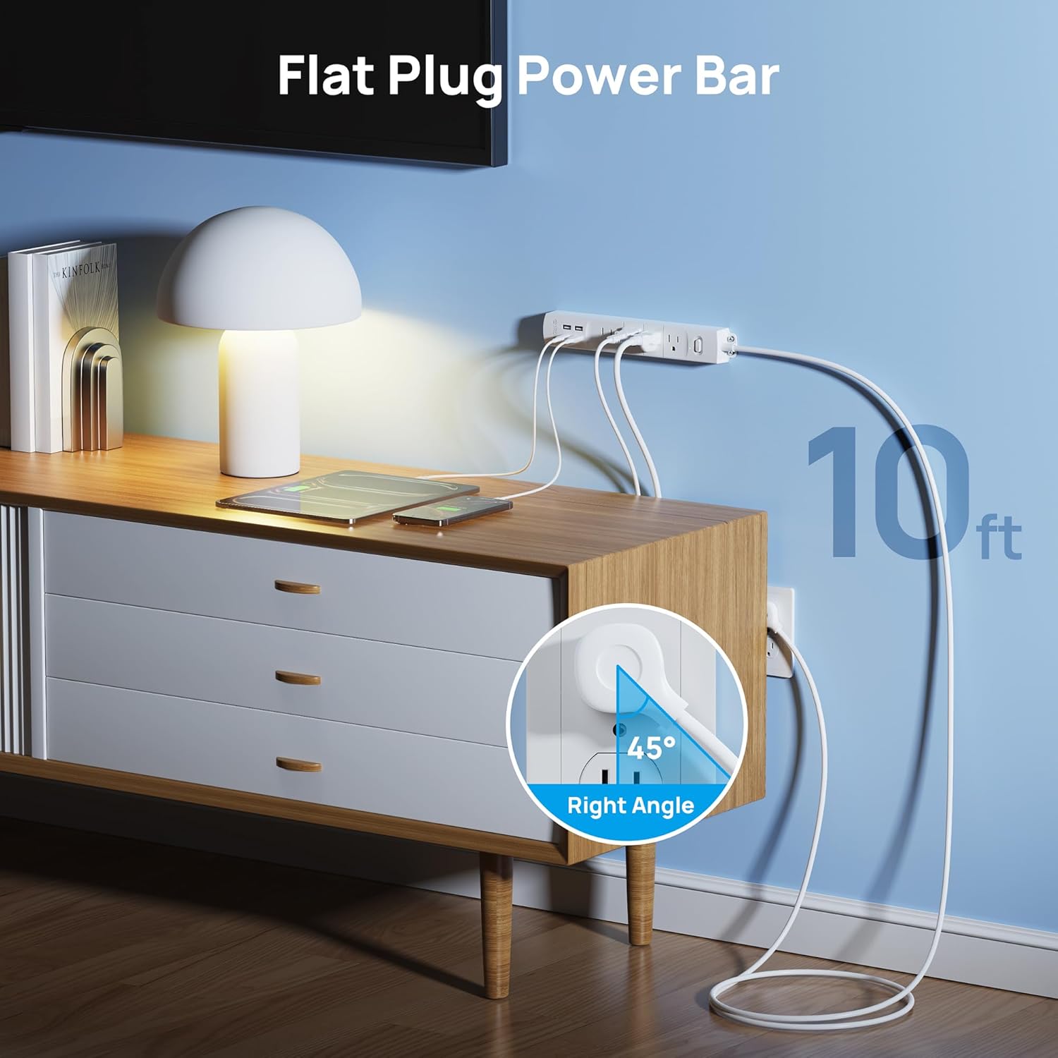 - 10ft Extesion Cord: This flat plug power strip comes with 10ft flat extension cord (1625W, 125V/13A), helping you get rid of tangling cords and cable clutter. The portable and slim size make it suitable for home office desktop workbench dorm room, etc.