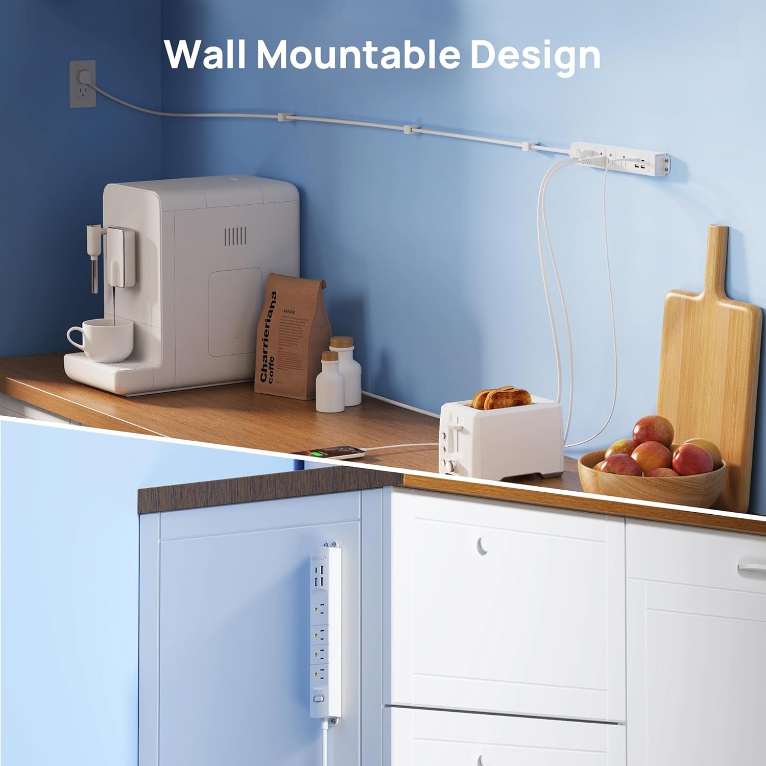 - Ultra Flat Plug & Wall Mountable: The low-profile right angled flat plug design is great for stashing under or behind furniture. Four screw-mounting tabs allow this wall mount flat plug power strip to be securely installed on workbenches, behind the tv, garage, bedside, under counters/desks/cabinets, and dressers.