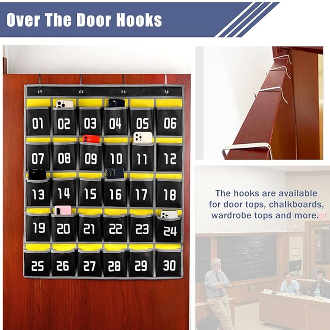 - 【4 Metal Hooks for Classroom Pocket Chart】 Calculator Phone pouch fit the top of whiteboard or over the door as thick as 1.3"-2", hanging organizer with pockets supports the weight of 30 phones (about 20 lb), easy to install and close the door.