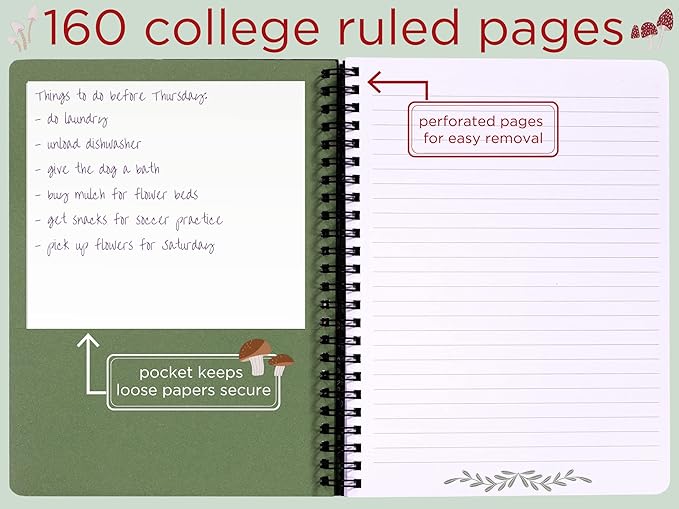 - INTERIOR POCKET: Features a durable hardcover with a trendy mushroom design and a double sided storage pocket to keep loose notes organized