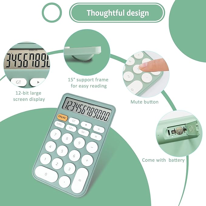 - BIG DISPLAY: Large button, candy color. Large LCD screen, 12-digit display, vertical back, 15-degree angle for easy-to-read calculator. One LR44 battery is included in the package