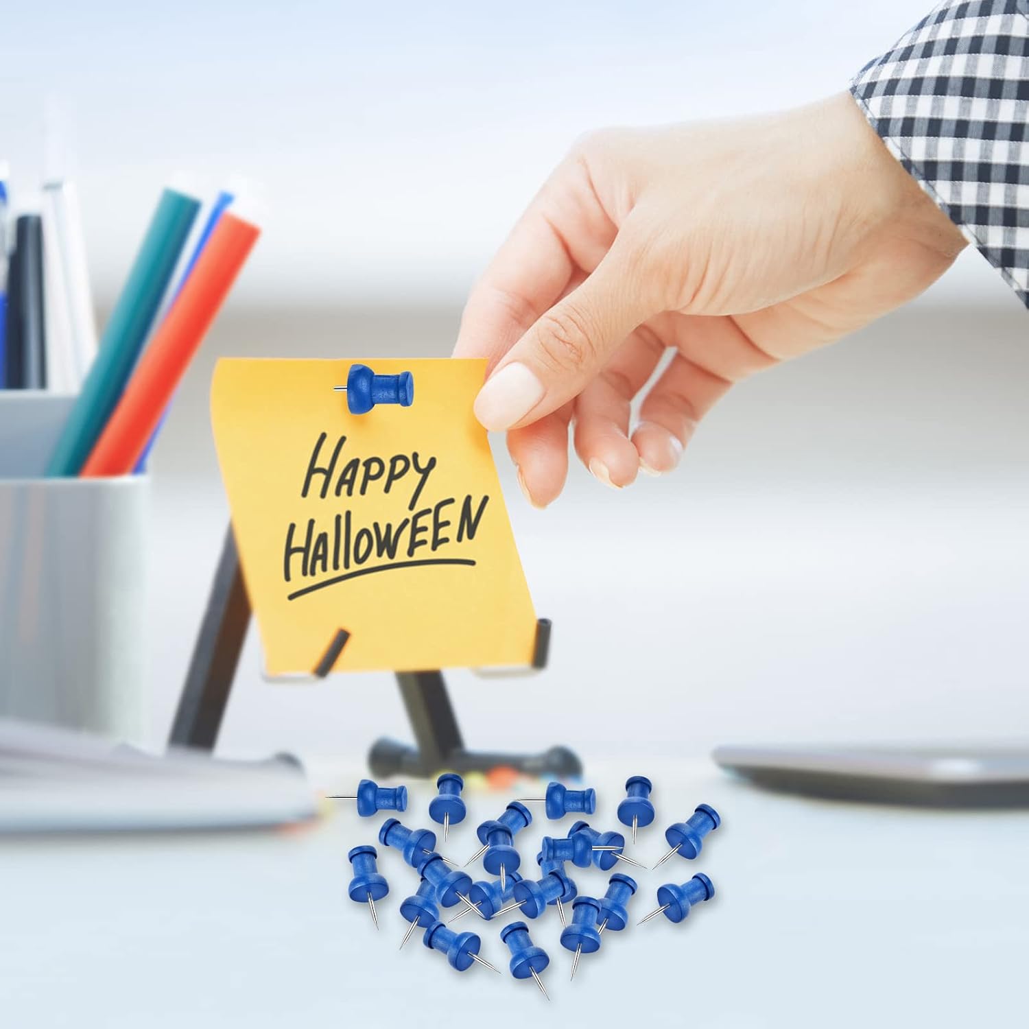 - Blue wooden push pins, which is environmentally friendly and adorable, could also be serve as a family decoration.