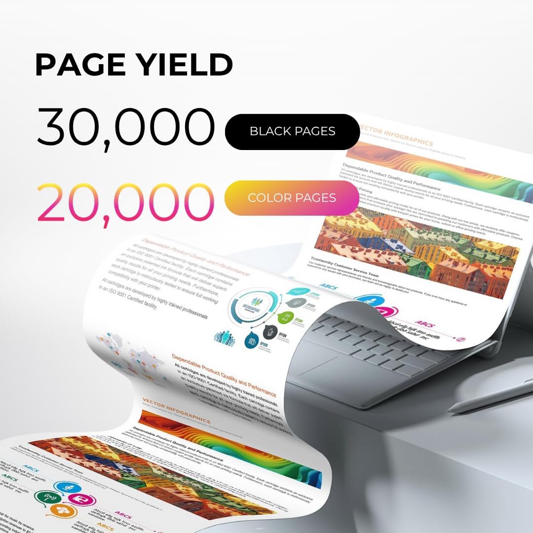 - HIGH PAGE YIELD: Delivers approximately 30,000 pages for Black and 20,000 pages for each Color (C/M/Y) at 5% coverage per ISO standards.