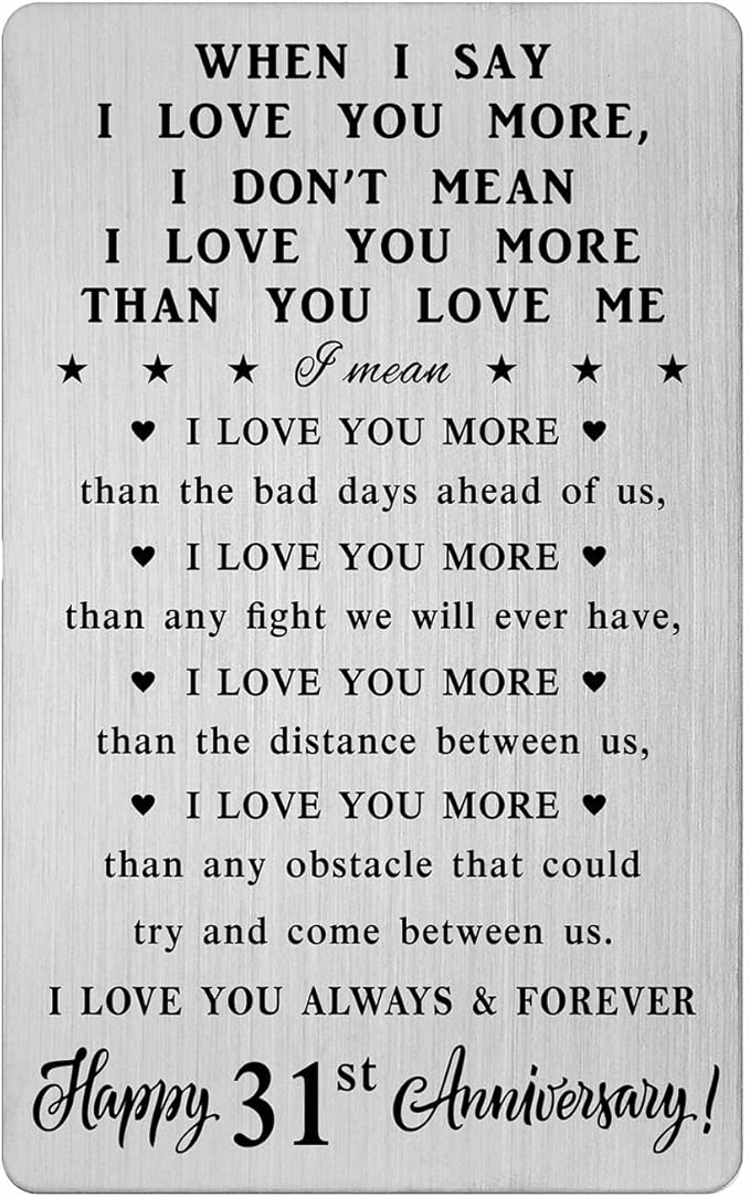 - Happy 31st Anniversary Wallet Card Gifts - When I say I love you more, I don't mean I love you more than you love me. I mean I love you more than the bad days ahead of us, I love you more than any fight we will ever have, I love you more than the distance between us, I love you more than any obstacle that could try and come between us, I love you always forever, Happy 31st anniversary!
