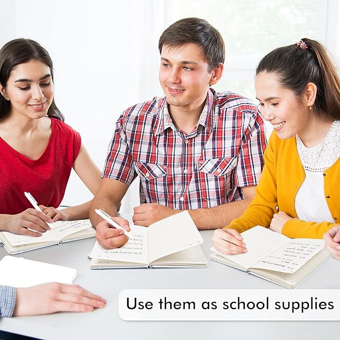 - Feela 3 Pack Classic Ruled Notebooks contains 3 white ruled sturdy cover notebooks and 3 Black Retractable Pens. Each of the notebooks measures 8.3” x 5.1”, which is perfect to carry and easily held by young girls and boys. These black cute pens are customized to be placed in the pen holder, which is pretty convenient.