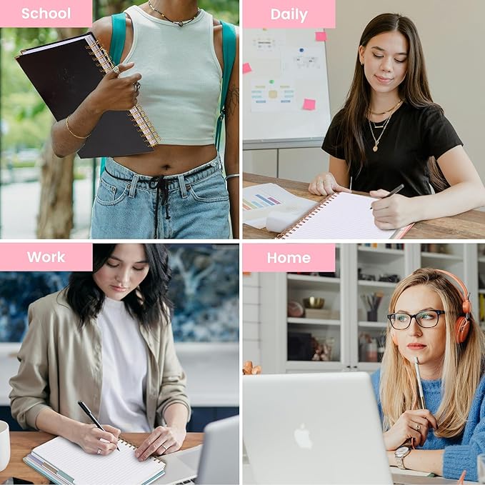 - 【HARDCOVER SPIRAL NOTEBOOK】 Never worry about ruined notes again with this spiral notebook's durable waterproof cardboard cover, protecting your 240 pages of college ruled, 100gsm paper from damage. With 10.3"x7.6" size, 4 golden metal corners, twin-spiral binding, and an information page to prevent loss, you'll have a reliable writing companion for important meetings and school work.