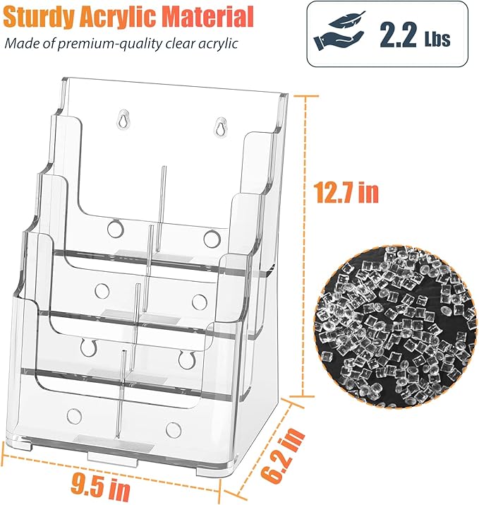 - 【TWO TYPES OF INSTALLATION】The bottom of the 4-tier flyer holder is very wide and can stand stably on the tabletop;. Because this acrylic brochure holder has hanging holes, you can hang it firmly on the wall (please note that screws are not included in the package).