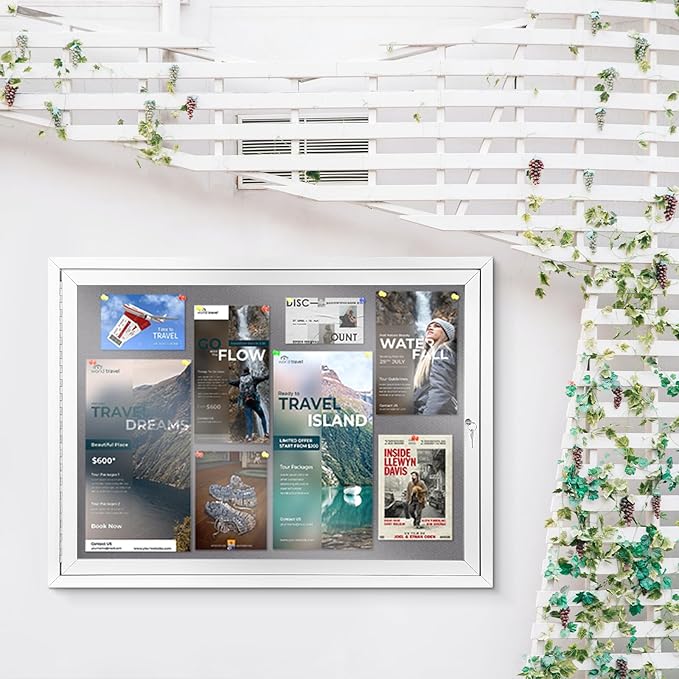 - 💧OUTDOOR USE —Weather resistant cabinet construction features aluminum frame with a satin finish, full-length piano hinges add strength and durability to the door frame. Drainage holes in the bottom and sealed backing means you can mount the board outdoors.
