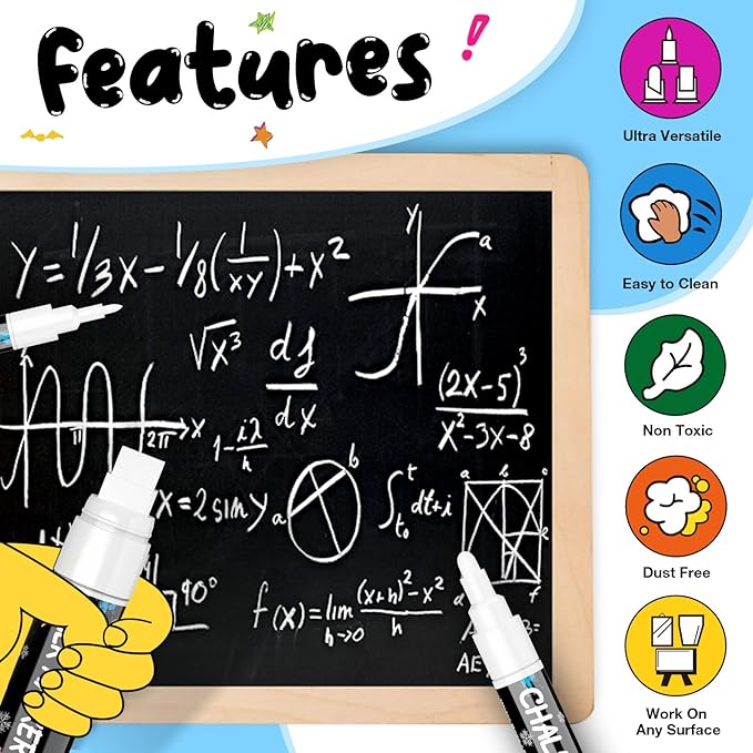 - 【Kid Safe & Odor Free】White window marker made with high quality water-based ink conforms to ASTM D-4236, dustless, non-toxic, odor free, quick dry white chalk markers pen. Kids will have so much fun drawing with this erasable white glass marker when they make mistakes or change their mind, white chalk paint markers comes right off with a damp cloth eraser, awesome classic white erase chalk markers pen that will make you or your kids a wonderful experience