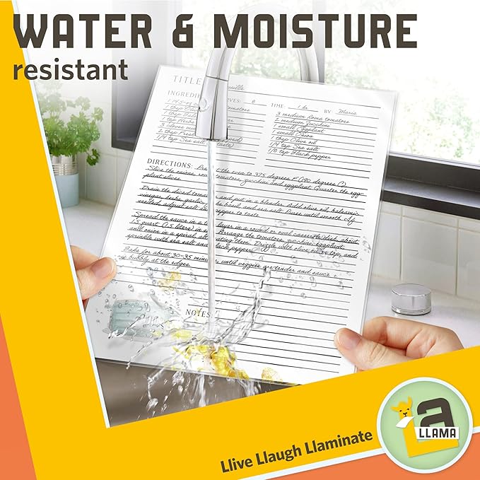 - 🦙PROFESSIONAL USE: laminating paper has premium double-coating of plastic film that protects from water, moisture, UV light, wrinkling, and staining; lamination pouches withstand frequent use