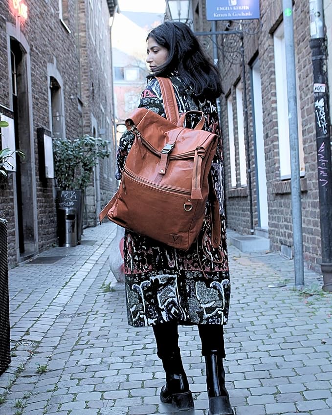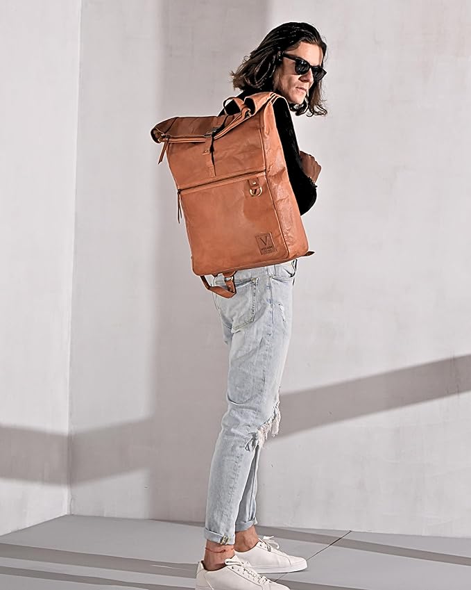 - SPACIOUS & ADAPTABLE - At 17.8"x13.8"x4.5", this large leather backpack offers room for all your essentials. Its roll-top design adjusts to your needs, perfect for daily use and spontaneous adventures.